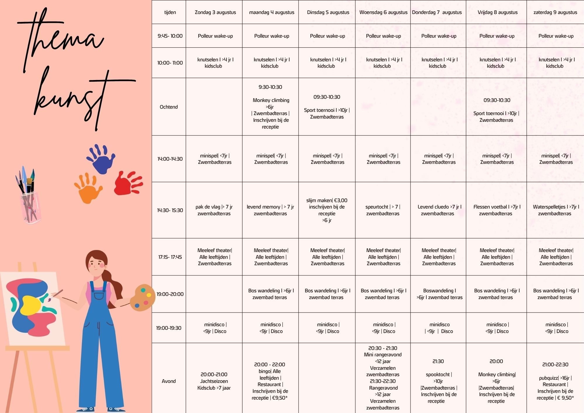 Tijdens Hemelvaart, Pinksteren en de zomervakantie bruist het bij ons van de activiteiten. De dag begint vrolijk voor de allerkleinsten in de Kidsclub, waar ze kunnen kleuren en knutselen. ’s Middags staan er gezellige spelletjes op het programma, en ’s avonds gaat het avontuur verder met meeslepend theater. Daarna barst het feest los op de dansvloer tijdens de minidisco!